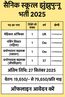 सैनिक स्कूल झुंझुनूं (Rajasthan) – स्टाफ भर्ती 2025 (संविदा)