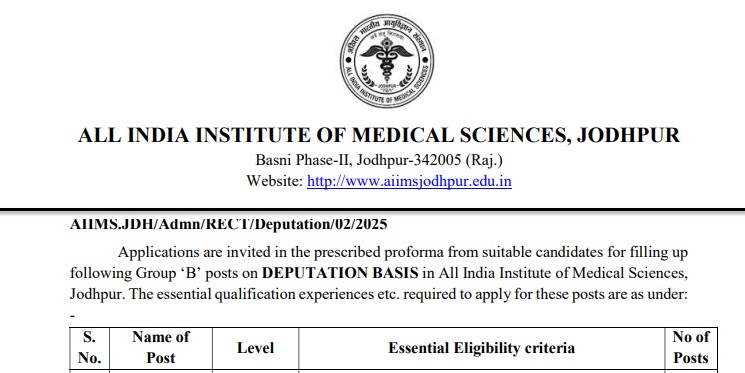 🏥 AIIMS जोधपुर में ग्रुप ‘A’ और ‘B’ के विभिन्न पदों पर डिपुटेशन के आधार पर भर्ती | आवेदन करें अभी! | विभिन्न पदों पर करें आवेदन