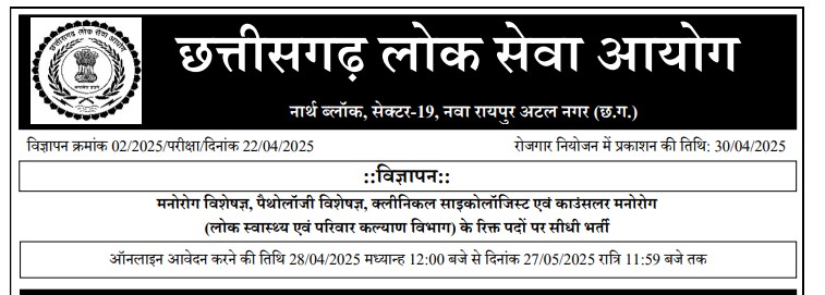 छत्तीसगढ़ लोक सेवा आयोग भर्ती 2025: मनोरोग विशेषज्ञ, पैथोलॉजी विशेषज्ञ, क्लिनिकल साइकोलॉजिस्ट और काउंसलर के लिए सुनहरा अवसर