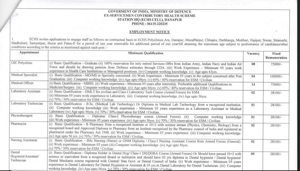भारत सरकार, रक्षा मंत्रालय के अंतर्गत ECHS (Ex-Servicemen Contributory Health Scheme), स्टेशन मुख्यालय दानापुर द्वारा विभिन्न पदों पर संविदात्मक नियुक्ति हेतु आवेदन आमंत्रित किए गए हैं। यह भर्ती पूर्व सैनिकों को प्राथमिकता देते हुए की जा रही है।