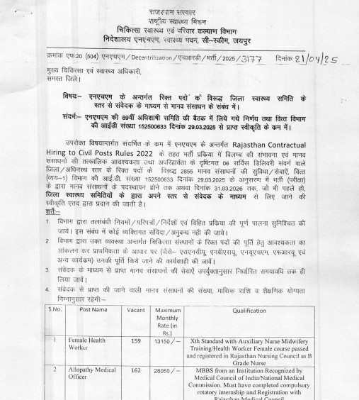 🏥 NHM राजस्थान संविदा भर्ती 2025: 2855 पदों पर संवेदक के माध्यम से भर्ती | आधिकारिक आदेश सहित