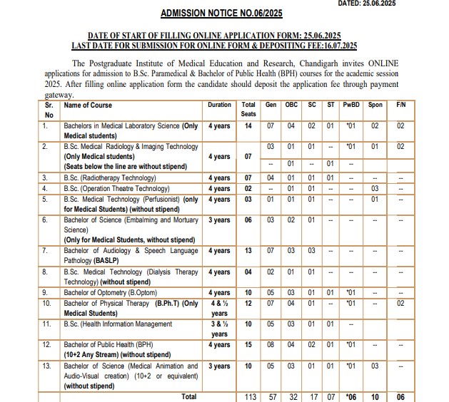 PGIMER चंडीगढ़ द्वारा B.Sc. Paramedical व Bachelor of Public Health (BPH) कोर्स के लिए 2025-26 के ऑनलाइन आवेदन शुरू। यहां जानें आवेदन प्रक्रिया, अंतिम तिथि, सीटें व अन्य महत्वपूर्ण जानकारी।