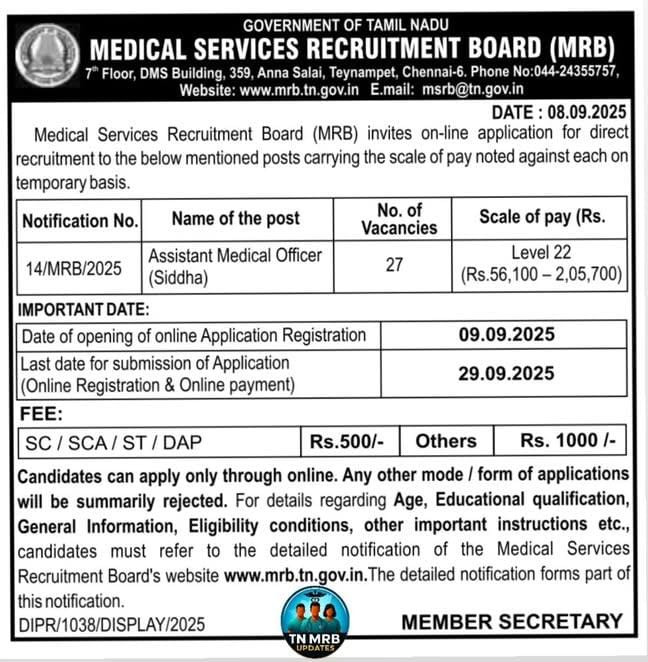 तमिलनाडु मेडिकल सर्विसेज रिक्रूटमेंट बोर्ड (MRB) असिस्टेंट मेडिकल ऑफिसर (सिद्धा) भर्ती 2025